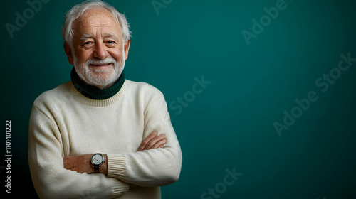 Smiling Senior Man in Cream Sweater Against Teal Background