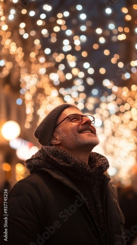 Smiling senior man is standing in the city at night, looking up at the christmas lights with a happy expression on his face. The warm glow of the lights creates a magical atmosphere