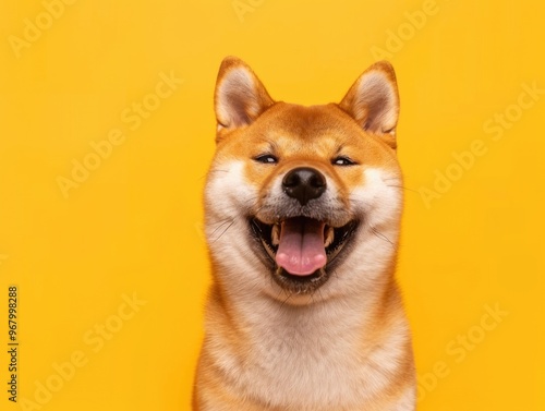 Smiling Shiba Inu against yellow background.