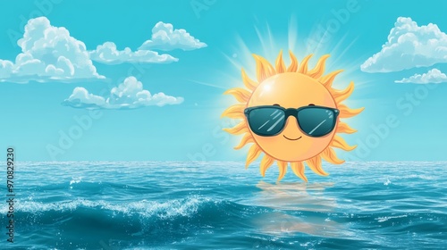 nature, background, art, travel, design, illustration, wave, summer, beach, sunglasses, bright, tropical, fun, wallpaper, seascape, sky, ocean, blue, cloud, cheerful, sun, holiday, happy, vacation, smiling, cartoon, sunshine