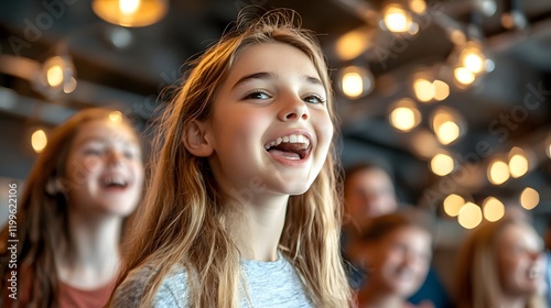 smile, teenage, karaoke, singing, performance, entertainment, family, happiness, joy, indoor, stage, microphone, laughter, music, fun, gathering, togetherness, youth, energy, excitement, expression, emotion, talent, hobby, activity, event, party, group, lifestyle, portrait, character, personality, social, culture, bond, human relationships, atmosphere, ambience
