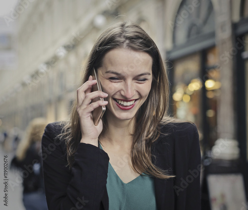 smile, laugh, joy, phone, smartphone, work, business, phone, mobile, city, fun, street, way, trip, blond, smiling, happy, walk, notice, travel