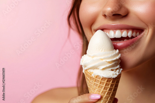 Smiling woman enjoying vanilla ice cream. Close up of female mouth with white teeth taking bite of ice cream cone against vibrant pink background