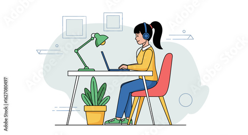 woman, laptop, earphones, desk, home office, workspace, productivity, illustration, vector, digital, technology, business, education, lifestyle, concentration, student, employee, freelance, telecommuting, professional, modern, happy, work, female, computer, cyberspace, learning, setup