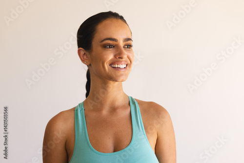people, portrait, woman, smiling, gazing, turquoise, sport, tank top, wellness, vibrant, casual attire, beauty, serenity, minimalism, young adult, white, female, dark hair, closeup, studio, beige, big smile, fashion, confidence, youth, healthy, natural, calm, elegance, model, one person, front view, jewellery, sleeveless, freshness, isolated, stylish, attractiveness, fitness, relaxed, simplicity