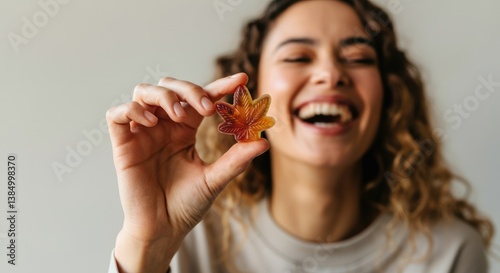 woman, smiling, happy, leaf, candy, sweet, dessert, treat, holding, curly, hair, close, up, joyful, autumn, snack, fun, light, hearted, colourful, cheerful, food, confectionery, positive, admiration, excitement, laughter, delicious, edible, playful, tasty, delight, happiness, brunette, young, pleasure, item, modern, wholesome, background, toothy, smile, casual attire, demeanor, macro, shot, sharpened, middle