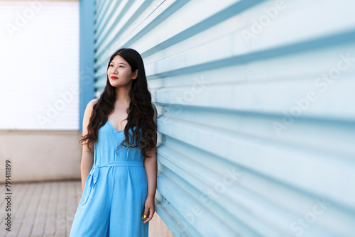 smiling, woman, blue, dress, leaning, shutter, 1, people, adult, outdoors, day, spain, beautiful, young, fashion, beauty, chinese, ethnicity, asian, colours, fashionable, style, lifestyle, looking, long hair, hair, black, roller, female