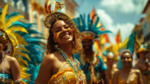 carnival, woman, costume, smiling, parade, vibrant, colours, festive, atmosphere, cultural, event, celebration, joyful, heritage, brazil, tradition, people, city, local, social, gathering, happiness, cheerful, public, lively, joyous, vivid colors