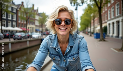 Smiling Woman in Glasses on Bicycle Near Canal in City Background