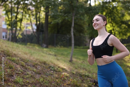 Smiling woman in sportswear running in park, low angle view. Space for text