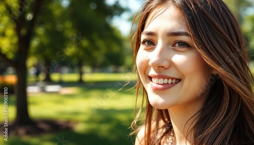 woman, smiling, happy, park, outdoors, nature, summer, sunshine, bright, joyful, positive, cheerful, beautiful, pretty, attractive, young, adult, female, girl, portrait, closeup, face, eye, hair, long hair, brown hair, teeth, smile, healthy, skin, fresh, clean, green, tree, leaf, grass, landscape, background, daytime, bright light, natural light, lifestyle, well-being, beauty, happiness, lady, outside