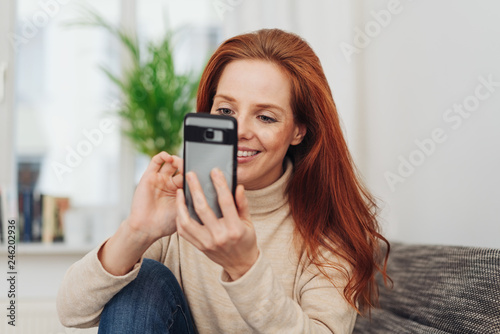mobile phone, woman, sofa, digital, web, typing, home, inside, people, person, red hair, leisure, lifestyle, casual attire, chill, lounge, app, device, smartphone