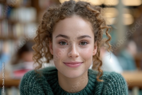 woman, curly hair, smile, portrait, head shot, young, happy, casual attire, indoor, natural light, beauty, fashion, lifestyle, people, female, expression, emotion, confidence, positivity, warmth, relaxation, comfort, mood, style, personal, cheerful, friendly, vibrant, radiant, approachable