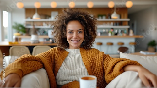 Smiling woman with curly hair relaxing on a sofa in a cozy living room with a cup of coffee, modern kitchen in the background.