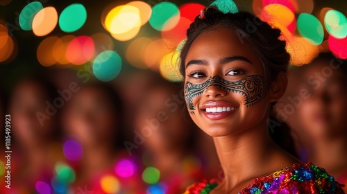 woman, face paint, smiling, festive, light, colourful, joyful, celebration, cultural, vibrant, happy, bokeh, festival, glowing, artistic, lively, ethnic, bright, party, cheerful, expressive, radiant, ornamentation, illuminated, decoration, traditional, joyous, beauty, community