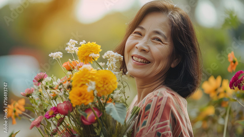 Smiling Woman with Flowers in Warm Light