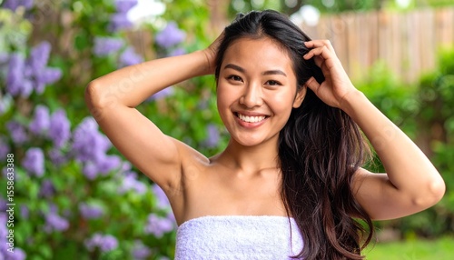 Smiling woman with hair tied up in one hand, lavender colored bikini