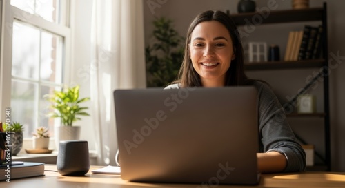 Smiling Woman Working from Home on Laptop in Sunny Room