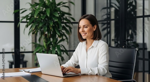 woman, laptop, office, desk, business, working, smile, professional, modern, workplace, employee, happy, career, computer, technology, workspace, corporate, confident, executive, female, job, occupation, manager, entrepreneur, leader, interior, indoor, plant, paper, tablet, document, window, light, room, successful, achievement