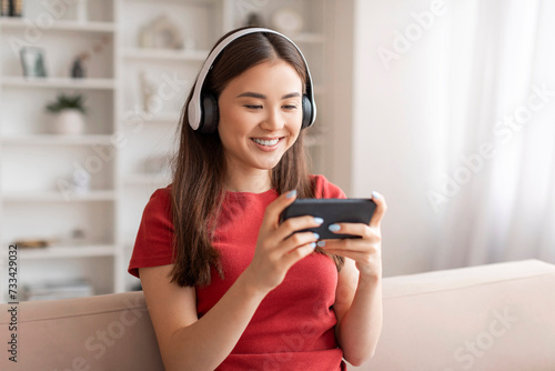 Smiling young asian woman wearing headphones engaging with her smartphone at home