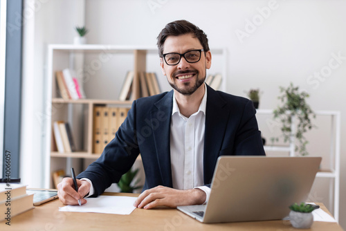 businessman, modern, business, office, professional, smile, desk, workspace, laptop, writing, note, work, report, suit, formal, productive, attire, male, young, corporate, adult, job, notebook, career, wear, caucasian, paper, employee, happy, man, success, computer, executive, entrepreneur, person, indoor, teamwork, setting, management, white, collar, presentation, people, occupation, businessperson, confident, portrait, looking, camera, posing
