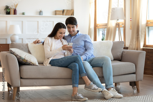 Smiling young caucasian couple sit relax on modern comfortable couch at home using smartphone together, happy man and woman rest on sofa in living room browse internet on cellphone gadget