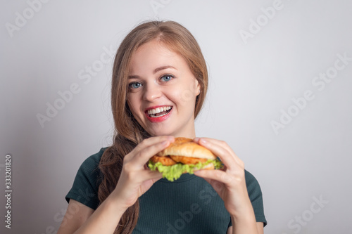 Smiling young Caucasian woman girl holding eating chicken burger