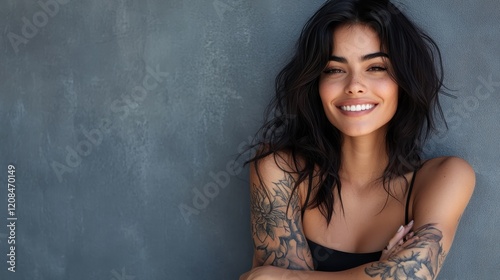 smiling, young, female, tattoo, grey, wall, woman, adult, brunette, hair, casual attire, happy, confident, stylish, expressive, inked, beauty, vibrant, relaxed, cheerful, portrait, skin, carefree, modern, trendy, lifestyle, fashion, attitude, outfit, art, decorative, arm, body, design, high-coloured, serene, joyous, content, expression, natural, pose, indoor, surface, texture, model, charismatic, dynamic