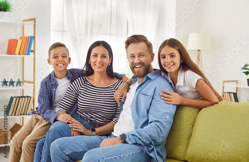 Smiling young happy family of four with two kids boy and girl sitting on the sofa at home and looking cheerful at camera. Portrait of parents with children. Family time and leisure concept.