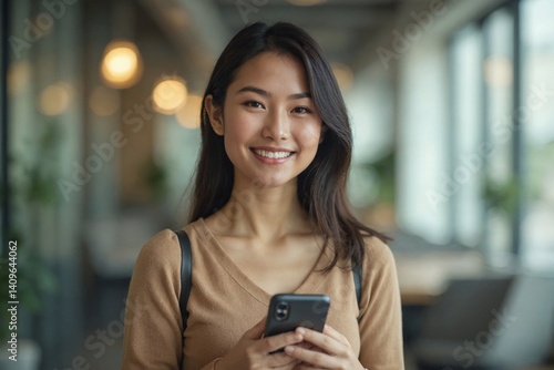 social, media, manager, japanese, woman, smiling, engaging, smartphone, mobile, online, digital, marketing, communication, community, network, cyberspace, technology, content, creator, website, app, platform, connection, interaction, full body, one person, young adult, casual attire, professional, top, indoor, office, work, job, career, modern, global, virtual