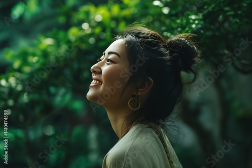japanese, woman, smile, greenery, nature, happiness, young, adult, portrait, serene, plant, connection, joy, sunny, profile, fresh, beauty, calm, peaceful, sunlight, bokeh, bliss, feminine, hair, bun, earring, casual attire, lifestyle, tranquil, candid, cheerful, portraiture, environment, elegance, urban, relaxation, scenic, wellness, youthful, attractive, foliage, bright, natural, light, adventure, enchanting, joyful, moment