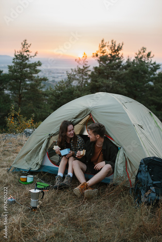 Smiling young man and woman having dinner near a tent in the mountains at sunset.