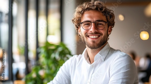 Smiling Young Man in Modern Cafe Setting