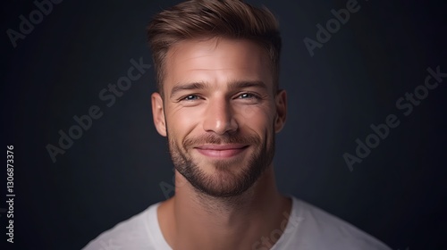 Smiling young man with short blonde hair wearing plain white t-shirt against dark background, confidence and warmth in expression