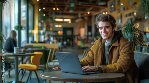 Smiling young man working on laptop in cozy modern cafe with warm lighting