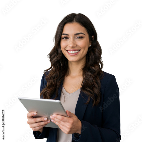 woman, female, businesswoman, professional, tablet, digital, technology, smiling, happy, cheerful, confident, corporate, business, office, work, elegant, stylish, blazer, jacket, suit, formal, dressed, smart, attractive, beautiful, young, adult, caucasian, portrait, cut-out, isolated, black background, modern, communication, online, app, cyberspace, device, browsing, touch screen, one person, studio shot, daytime, positive