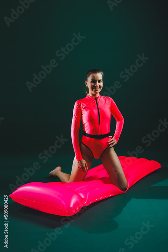 Smiling young woman dressed in a pink swimsuit posing while standing with an inflatable pink mattress on an isolated background. Summer vacation. Pink air mattress.