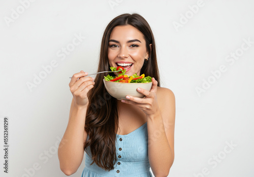 woman, missy, female, smiling, happy, cheerful, eating, salad, healthy, food, vegetable, fresh, bowl, fork, nourishment, diet, lifestyle, wellness, well-being, vitality, greener, organic, vegetarian, vegan, meal, lunch, dinner, studio shot, white background, portrait, natural light, brown hair, beautiful, healthy eating, enjoyment, happiness, carefree, indoor, person, adult, one person