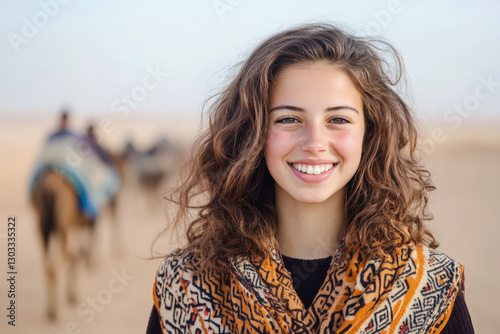 Smiling young woman in patterned scarf standing in a desert with camels in the background, enjoying a sunny day during Egyptian travel.