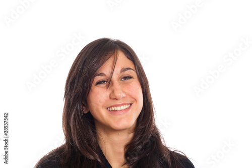 woman, vertical, portrait, human face, people, character, real people, young adult, one person, female, beauty, adult, white, beautiful, caucasian, brown hair, facial expression, casual attire, mug shot, studio shot, long hair, cute, color image, attitude, photo, black hair, femininity, happiness, isolated, front view, smiling, kissing, pensive, laugh
