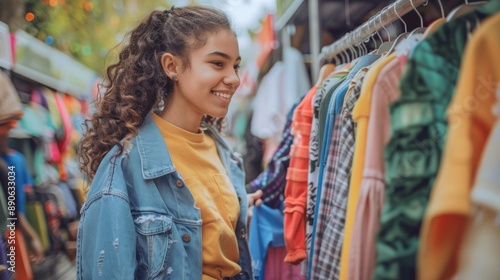 shopping, woman, market, young, colourful, smiling, fashion, casual attire, browsing, vibrant, trendy, urban, apparel, joyful, denim, weekday, client, cheerful, retail, curly, beautiful, shop, style, consumer, rack, browse, fabric, accessory, choosing, exploring, boutique, clothing, casual clothes, modern, summer, happy, carefree, looking, sunny, daytime, jacket