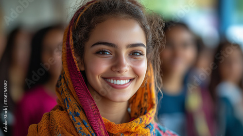 Smiling young woman wearing a colorful scarf among a diverse group of friends