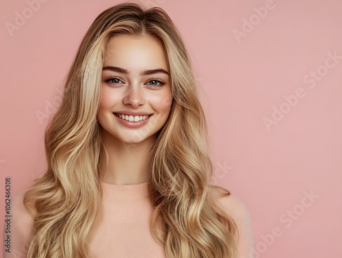 model, blond, person, long, make-up, smile, care, face, hair, studio, woman, young, beauty, fashion, pink, background, cosmetic, glamour, lady, pastel, skin, coiffure, looking, smiling, isolated, portrait, template, 1, colours, elegant, product, salon, stylish, trendy, copy space, pretty, female, groomed, happy, white, attractive, banner, cute, healthy, style, flat, natural, chic, expression