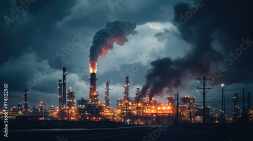 smoke, chemical, plant, night, illustration, smokestack, plume, backlit, light, dramatic, ominous, industrial, factory, pollution, emission, atmosphere, glow, darkness, silhouette, infrastructure, machinery, production, refinery, hazard, environment, safety, toxic, fume, illumination, shadow, skyline
