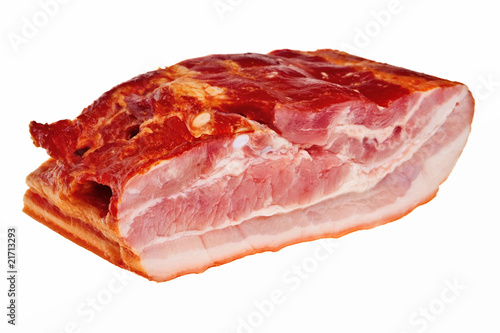 Smoked bacon chunk isolated over white background.