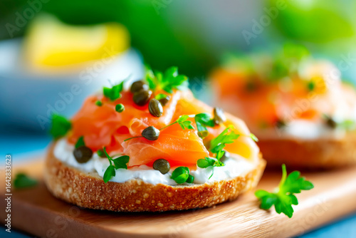 smoked, salmon, bagel, cream, cheese, caper, wooden, board, closeup, food, breakfast, brunch, delicious, savoury, indulgent, comfort, meal, appetising, colourful, textured, healthy, tasty, homemade, epicure