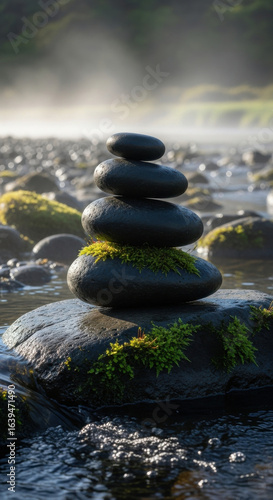 Smooth black stone stack, balanced on mossy rock in tranquil river, surrounded by mist and soft sunlight, evokes peaceful, meditative, and harmonious atmosphere in nature
