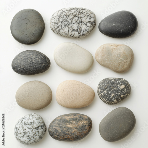 Smooth river stones arranged artistically on a pure white surface for peaceful composition