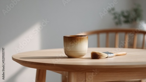 smooth, wooden, table, single, brush, small, pot, decoupage, glue, setting, space, subtile, play, light, highlight, texture, bristle, readiness, creative, venture, composition, explore, simplicity, potential, attention, clean, line, muted, tone, peaceful, atmosphere, encouraging, introspection, distinct, sense, calm