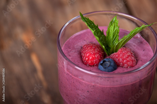 Smoothie with raspberries and blueberries with mint leaves with yogurt